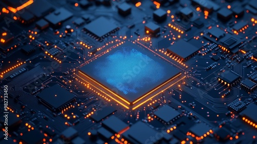 A futuristic chip with blue and red lighting on the circuit board in the isometric view