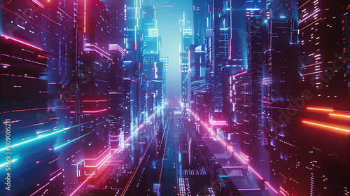 A futuristic cityscape bathed in neon light, with a focus on precision and accuracy,