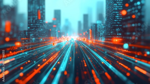 A futuristic cityscape featuring vibrant lights and abstract patterns, illustrating the concept of speed and technology in urban life.