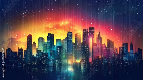 A futuristic cityscape silhouette with a glowing sunset and neon rain. Cyberpunk Cityscape Night. Illustration