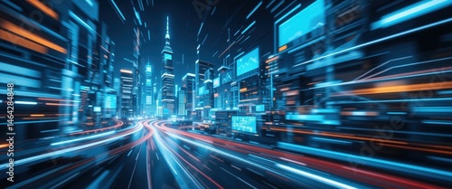A futuristic cityscape with bright neon lights, digital screens, and light trails depicting fast-moving technology and urban life.
