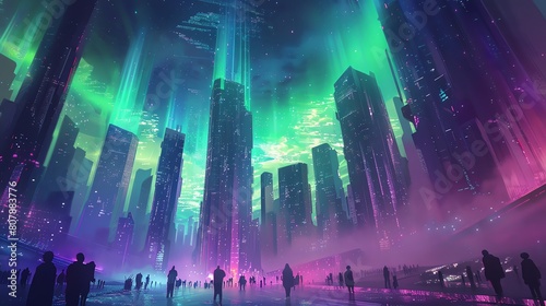 A futuristic cityscape with towering crystal skyscrapers blending into an aurora-filled sky, as graceful nanobots dance in formation, inspired by ballet and martial arts