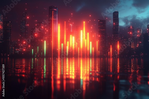 A futuristic cityscape with vibrant neon lights reflecting on water.