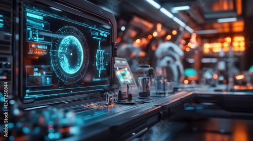 A futuristic control room featuring a glowing display, advanced technology, and an ambient lighting setup, creating a sci-fi atmosphere.