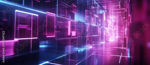 A futuristic corridor with glowing neon lines and geometric shapes.