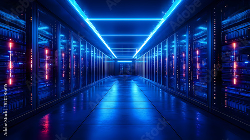A futuristic data center corridor illuminated with blue neon lights and server racks.