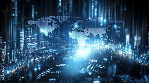 A futuristic digital landscape with glowing blue lights and a world map, symbolizing global connectivity and technological advancement in a virtual environment.