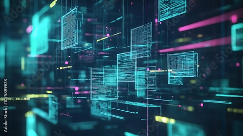 A futuristic digital landscape with glowing data blocks and lines representing technology and information flow.