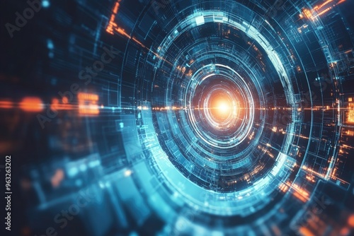 A futuristic digital vortex showcasing vibrant blue and orange lights, symbolizing technology and innovation.