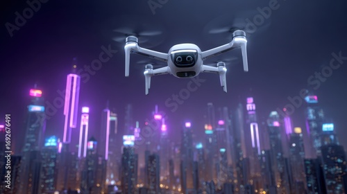 A futuristic drone hovers over a vibrant city skyline illuminated by neon lights, showcasing technology and innovation in urban settings.
