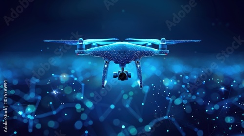 A futuristic drone with a camera flying through a network of glowing blue lines.