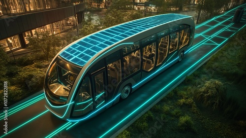 A futuristic electric bus gliding through a green, energy-efficient city, powered by solar panels embedded in the roof.