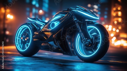 A futuristic electric motorcycle with neon blue lights, studio shot