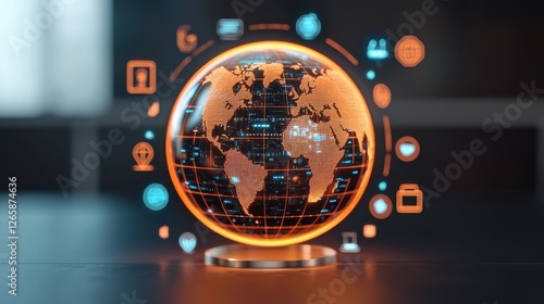 A futuristic globe displays interconnected digital icons, symbolizing global technology and data exchange.