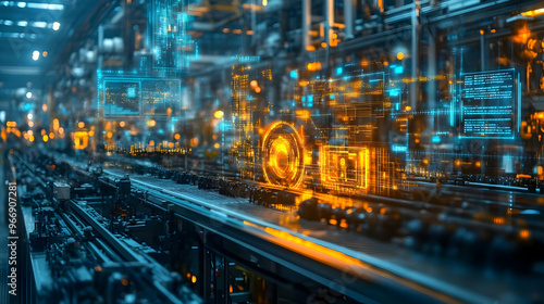 A futuristic industrial scene with glowing machinery and digital interfaces.
