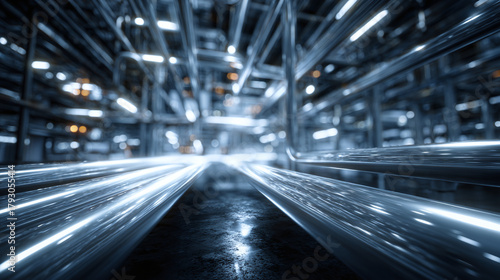 A futuristic industrial warehouse interior with bright lighting and metal pipes. The image has a blur effect, which gives a sense of fast movement