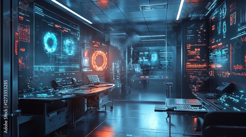 A futuristic lab with glowing holographic medical equipment, symbolizing advanced healthcare