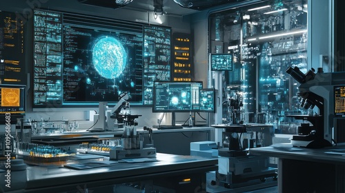 A futuristic laboratory filled with advanced technology and scientific equipment.