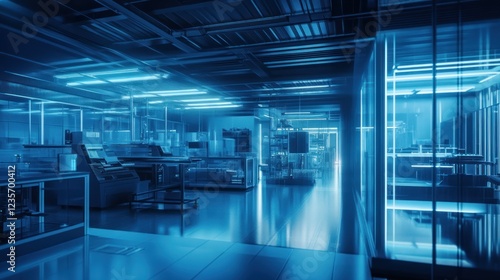 A futuristic laboratory with blue lighting and advanced equipment.