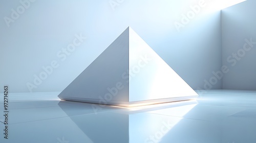 A futuristic pyramid design with a high-tech white glossy surface and a holographic glow, set against a minimalist background that emphasizes clean lines and geometric precision.