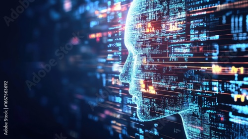 A futuristic representation of artificial intelligence, showcasing a digital face overlayed with vibrant data streams