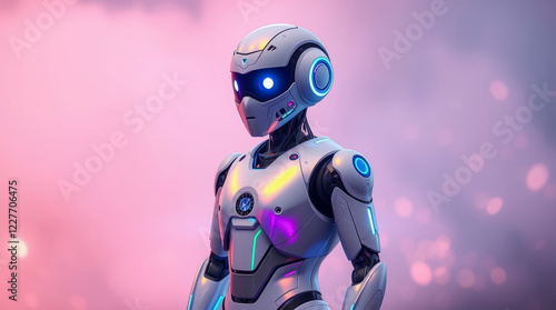 A futuristic robot with glowing blue eyes and neon accents stands against a soft pink background.