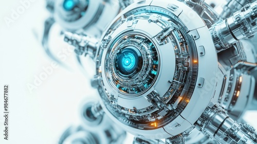 A futuristic robotic eye with intricate mechanical details and glowing elements.