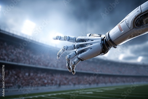 A futuristic robotic hand reaching forward over a sports stadium illuminated by bright lights, symbolizing advanced technology and the future of athletics competition.