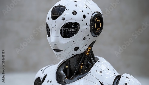 A futuristic robotic humanoid with electronic facial features and detailed components