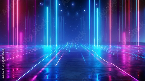 A futuristic scene featuring vibrant neon lights creating an immersive atmosphere, ideal for technology and nightlife themes. Stage for product presentation.