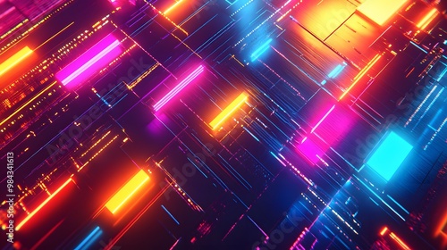A futuristic tech abstract with neon glowing geometric shapes and vibrant color spectrum, featuring digital circuit board aesthetic with cyberpunk style on a dark background.