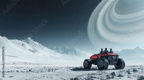 A futuristic vehicle explores a lunar landscape under a stunning ringed planet, capturing the essence of space adventure and exploration.