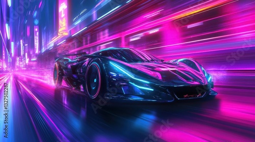 A futuristic vehicle speeding down a neon lit city street