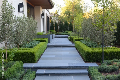 A garden pathway made of interlocking stones leads to a set of steps surrounded by neatly trimmed hedges