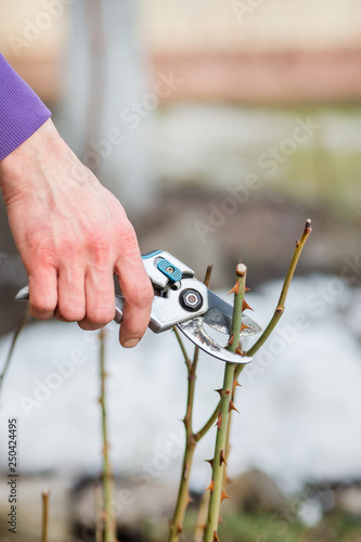 A gardener man cuts branches of bushes and trees in his garden.