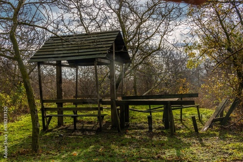 a gazebo and a garden bench made of boards on a forest lawn overgrown with green grass in the mountains of the Western Caucasus on a sunny day in late November