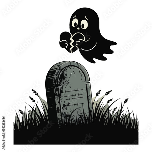 A ghost holding a skull-shaped balloon hoverinA sad little ghost holding a broken heart floating above a gravestone in black silhouette vector g over pumpkins in black silhouette vector