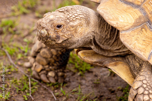 A Giant Old Turtle Within A Zoo Enclosure Walking Around