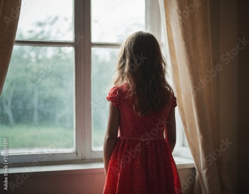 A girl in a red dress is looking out the window. The girl appears to be feeling lonely or sad