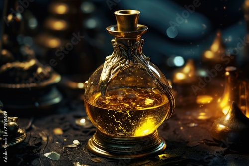 A glass bottle filled with liquid sitting on top of a table. Suitable for various uses