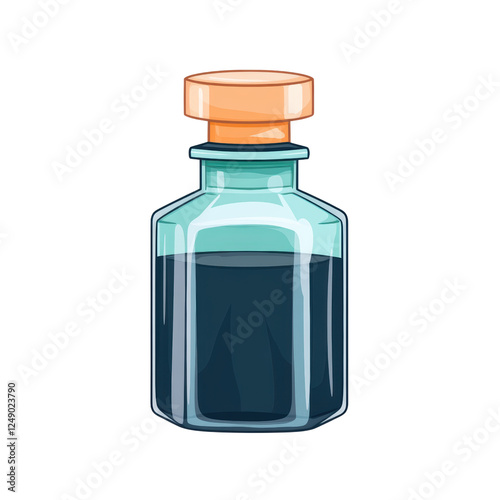 A glass bottle with a blue liquid, featuring a light orange cap.