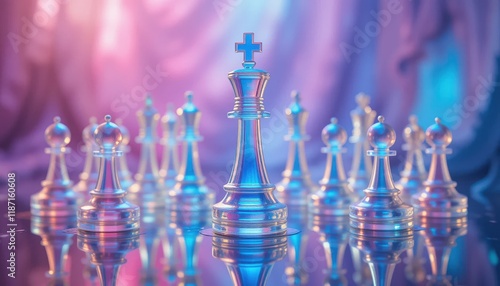 A glass chess set with a reflective and glossy finish, featuring a vibrant pink, blue, and purple gradient background with a holographic effect, creating a smooth and mesmerizing aesthetic.
