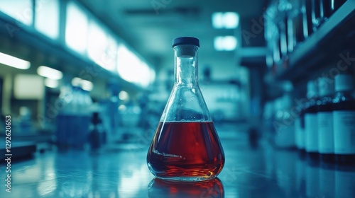 A glass Erlenmeyer flask filled with dark red liquid sits on a lab bench. This image depicts scientific research and chemical processes.