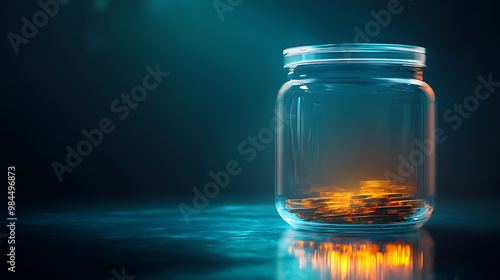 A glass jar sits on a dark blue surface, filled with gold coins that glow from within. The jar reflects the light, creating a mesmerizing image of wealth and prosperity.