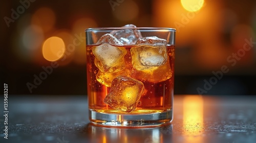 A glass of amber-colored beverage with ice cubes amidst a blurred, warm backdrop.