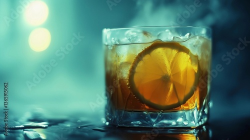 A glass of drink with a slice of lemon in it. The drink is a cocktail and the glass is clear
