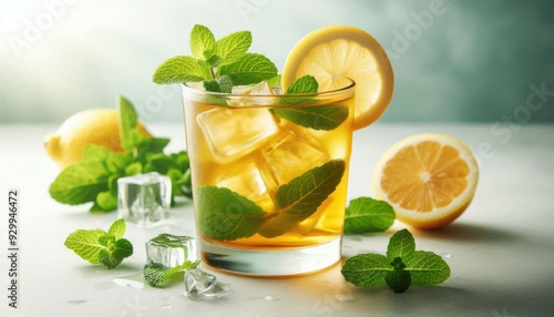 A glass of minty lemonade iced tea , refresh your hot summer