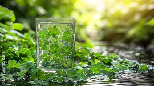 A glass of water surrounded by green clovers in the water