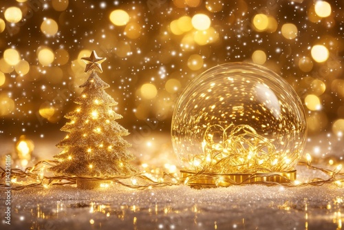 A glass snow globe houses a snowy Christmas tree, with its surroundings bathed in bokeh lights