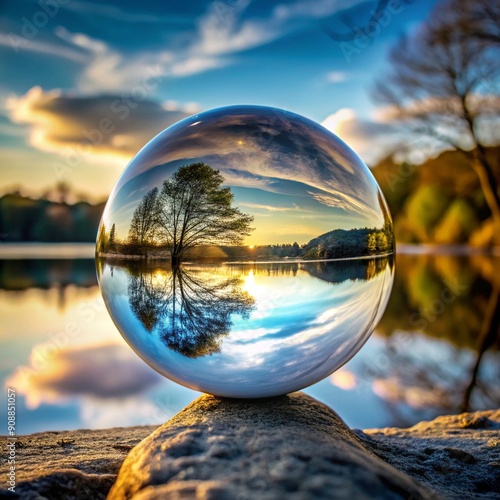 A glass sphere installed by a lake, depicting an inverted landscape of trees, water and sky.